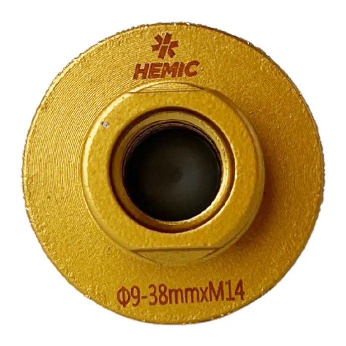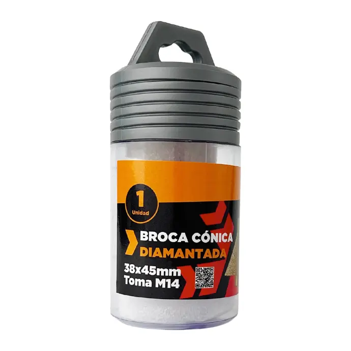 Broca cónica con diamante sintético HPHT, ideal para porcelanato, gres esmaltado, mármol, klinker y cerámica. Compatible con esmeril angular de 4,5" (toma M14) y 13.300 RPM para un avance estable y preciso. Disponible en Ø9×38 mm y Ø9×50 mm. Recomendado refrigerar con agua y usar EPP para máxima vida útil y seguridad.
