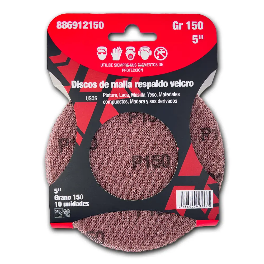 Lijado eficiente y sin obstrucciones. Fabricado con óxido de aluminio sobre malla de poliéster reforzada, ofrece alta resistencia y flexibilidad en superficies curvas. Ideal para madera, plástico, metal y más. Compatible con roto orbitales y amoladoras con plato soporte.